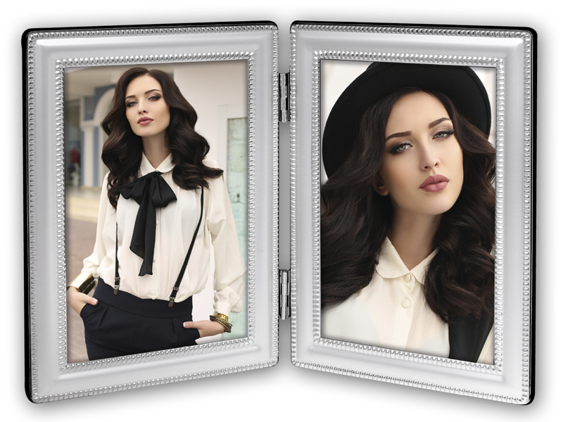 Ezüst színû képkeret, bársonnyal borított hátlappal Berakható képek mérete: 2 db 10*15 cm Kitámasztható asztali kivitel
