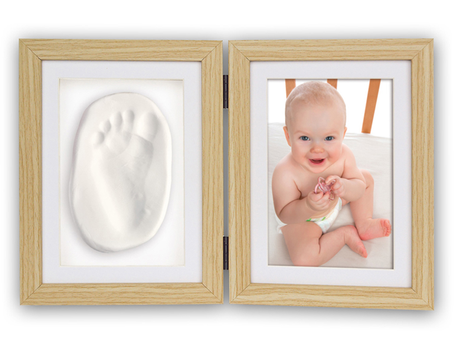 Fa babás képkeret és kéz/láblenyomat egybenBerakható kép: 10*15 cmKitámasztható asztali kivitelA szett tartalmazza a lenyomathoz szükséges gyurmát
